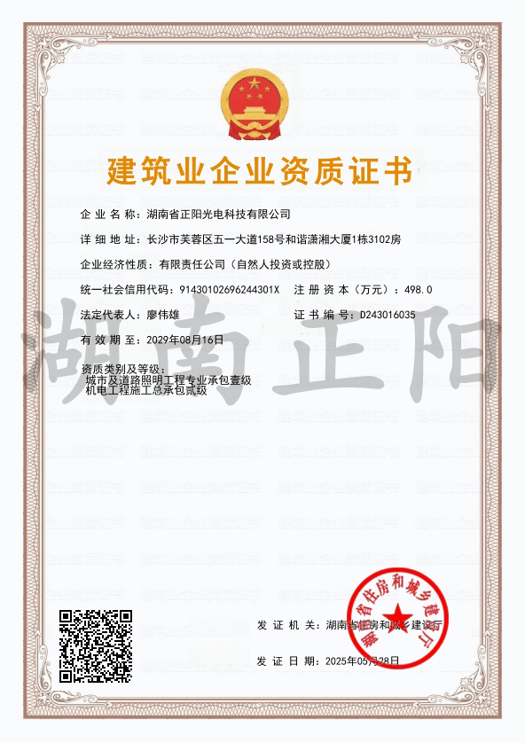 湖南省正陽光電科技有限公司是一家從事亮化工程及大型燈光藝術的設計、制作、安裝和維護于一體的專業化公司。公司資質齊全、管理嚴謹、技術先進、實力雄厚,取得了城市及道路照明工程專業承包壹級資質、照明工程設計專項甲級資質、機電工程施工總承包貳級資質、施工勞務等資質,榮獲“重質量·守誠信”示范企業。